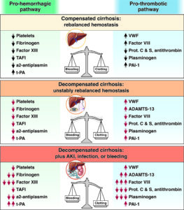 Beaucoup de choses ont évolué au cours des 25 dernières années en ce qui concerne la coagulopathie des maladies du foie. Paradoxalement, cette forme de coagulopathie est relativement hypercoagulable malgré l’impression clinique courante d’une tendance hémorragique. Cette dernière est largement influencée par la pression veineuse portale-mésentérique (c’est-à-dire l’hypertension portale) et n’a que peu à voir avec les voies hémostatiques. On ne saurait trop insister sur le fait que l’INR n’offre vraiment pas de mesure significative dans cette situation et peut conduire à des interventions telles que la FFP qui peuvent en fait aggraver la pression portale et donc les saignements induits par la pression. En ce qui concerne les saignements liés à la procédure, nous soulignons des différences substantielles dans la définition des procédures à haut risque et nous avons proposé une nouvelle définition opérationnelle dépendante de l’applicabilité des mesures hémostatiques locales, bien que cela nécessite une enquête plus approfondie. La survenue fréquente de thrombose veineuse chez ces patients nécessite un examen attentif des voies hémostatiques et des risques et avantages globaux de l’intervention. La décision concernant le traitement anticoagulant doit être motivée par une évaluation globale incluant les antécédents de saignement lié à l’hypertension non portale, mais également par le risque de chute chez les patients sujets à l’encéphalopathie pouvant entraîner un traumatisme crânien. Ceci est probablement mieux estimé par la fragilité, mais n’a pas encore été suffisamment étudié. En arrière-plan de ces préoccupations, plusieurs conditions superposées et compliquées dont les infections et les dysfonctionnements rénaux doivent être prises en compte. Les formes héréditaires de thrombophilie dans le cadre de la cirrhose ne l’emportent peut-être pas sur la thrombophilie inhérente à la maladie du foie, mais méritent un examen plus approfondi.