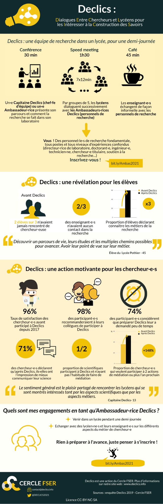 Practically speaking, high school students will attend a special Declics encounter lasting half a day. Declics (Dialogues Entre Chercheurs et Lycéens pour les Intéresser à la Construction des Savoirs) is a half-day program based on three-steps. You can find more information about it here.