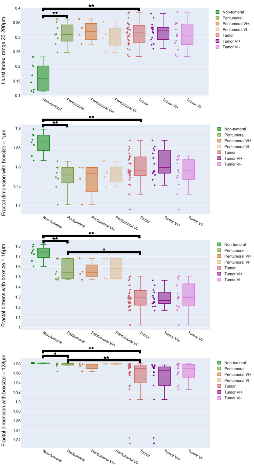 Tumor vasculature architecture influences treatment response, particularly in hepatocellular carcinoma (HCC) where anti-angiogenic therapies are standard. Although CD31 is a positive endothelial stain, classical CD31-derived metrics –such as vessel density or area fraction–primarily quantify vascular abundance and provide limited insight into organization. These metrics cannot reliably separate vascular phenotypes across tissue regions when organization, rather than quantity, is the discriminating feature. To address this gap, we investigated whether mathematical, scale-dependent descriptors could distinguish vascular organization beyond what classical metrics capture. Here, fractal dimension and Hurst index were derived on vessels segmented from 29 CD31-stained HCC samples across tumoral, peri-tumoral, and distant non-tumoral regions, with/without vascular invasion–a key prognostic indicator. Statistically significant differences (p<0.01) in fractal dimension were observed between the three regions between 16 – 128µm box size, whereas extremal scales showed no differences. The Hurst index exhibited similar differences emerging within the 20 – 200µm range. This fractal disparity reflects underlying differences in vessel-shape distributions, with tumoral regions containing fewer small, round vessels than non-tumorous tissue. Conversely, vascular invasion did not yield significant differences (p>0.1). These findings demonstrate robust regional differences in vascular organization in HCCs, supporting future studies investigating vascular fractality through non-invasive imaging approaches.